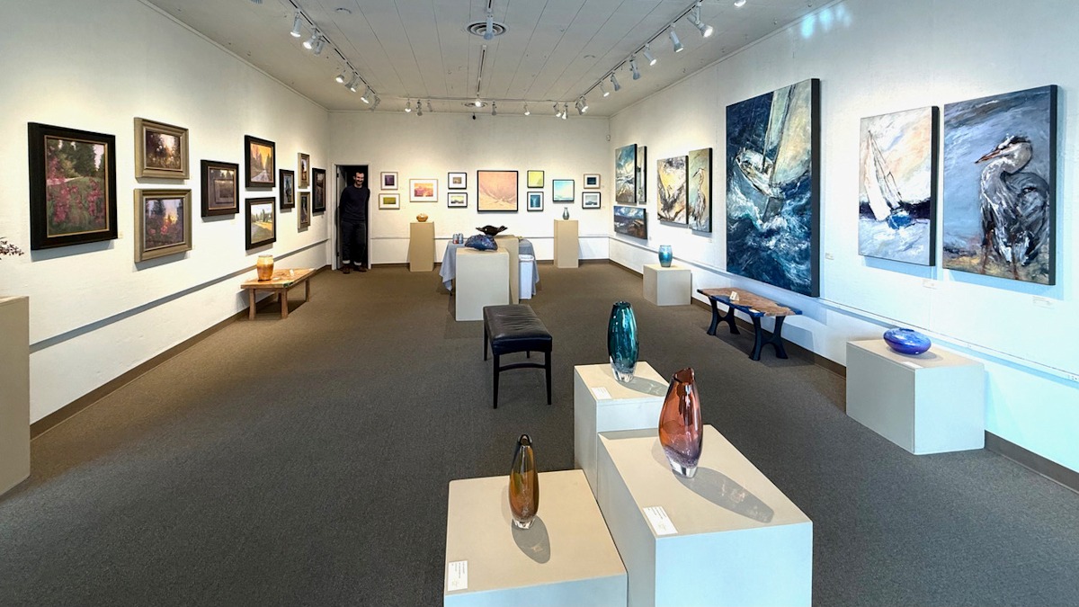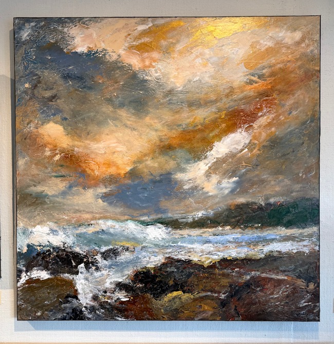 Christopher Mathie’s works in acrylic occupy the right wall. Mathie lives near the sea and knows his seascapes well. He offers a more up-close delightfully confrontational, immersive and invigorating environment. Like a good walk (or sail) in the PNW on a blustery day, Mathie’s paintings are grounding, up-close and personal. The large scale of the paintings, and super large highly textured brushstrokes with flashes of metallic gold make you feel like you are living in the painting itself; just you and the elements. You can almost feel the wind in your hair and the water spray on your face. Distance is suggested but his focus is the immediate. Mathie uses a limited color palette using both pure and impure colors. The paint is gestural, employing dry brush techniques for blending, texture and contrast. With Mathie’s environments you are invited to be in the moment with the painter, your senses overwhelmed, your cares abandoned.