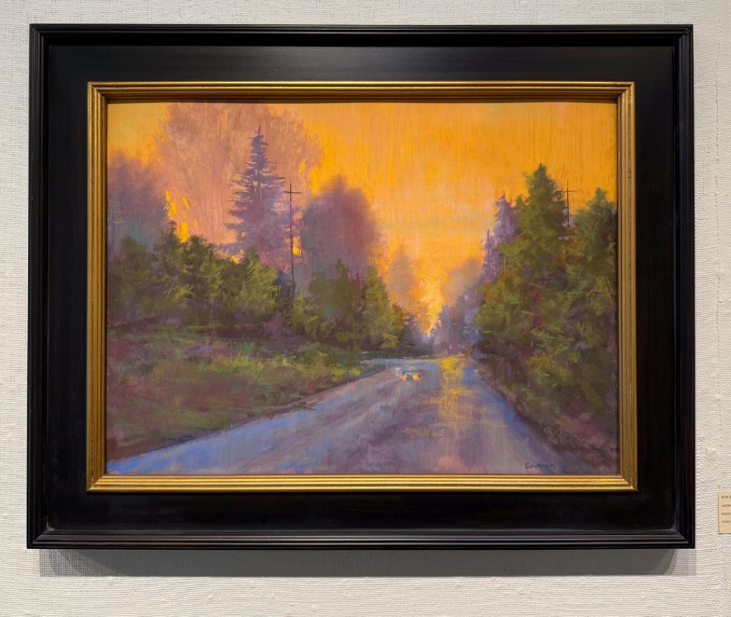 Kim Eshelman’s works on the left wall are colorful, dancing, middle-distance, dreamlike meadowscapes and landscapes. Occasional paths or vistas are surrounded by the light playing on lush trees, foliage, brightly colored flowers, or dandelion clocks. They invite you to follow, leading deeper into a mesmerizing bucolic world. Her palette is bold, varied and adventurous. Her pastel strokes are so fluid, from a distance they read like paint. They are flowing and gestural with sudden and surprising sweeps and strokes, but as they are pastel, the layers are highly textured and shimmering with juxtaposed colors. The layers of intense color cleverly bounce back and forth until we’re not sure which color came first. There is much skill and strength in the confusion, like Eshelman is playing with your senses. The layers boldly and skillfully suggest distance with an inner glow and impressionistic color sensibility. Her hues and values are robust but at the same time subtle and sensitive, inviting you to occupy the liminal space between taking that walk with her, while at the same time reveling in the pure abstract joy of the medium.