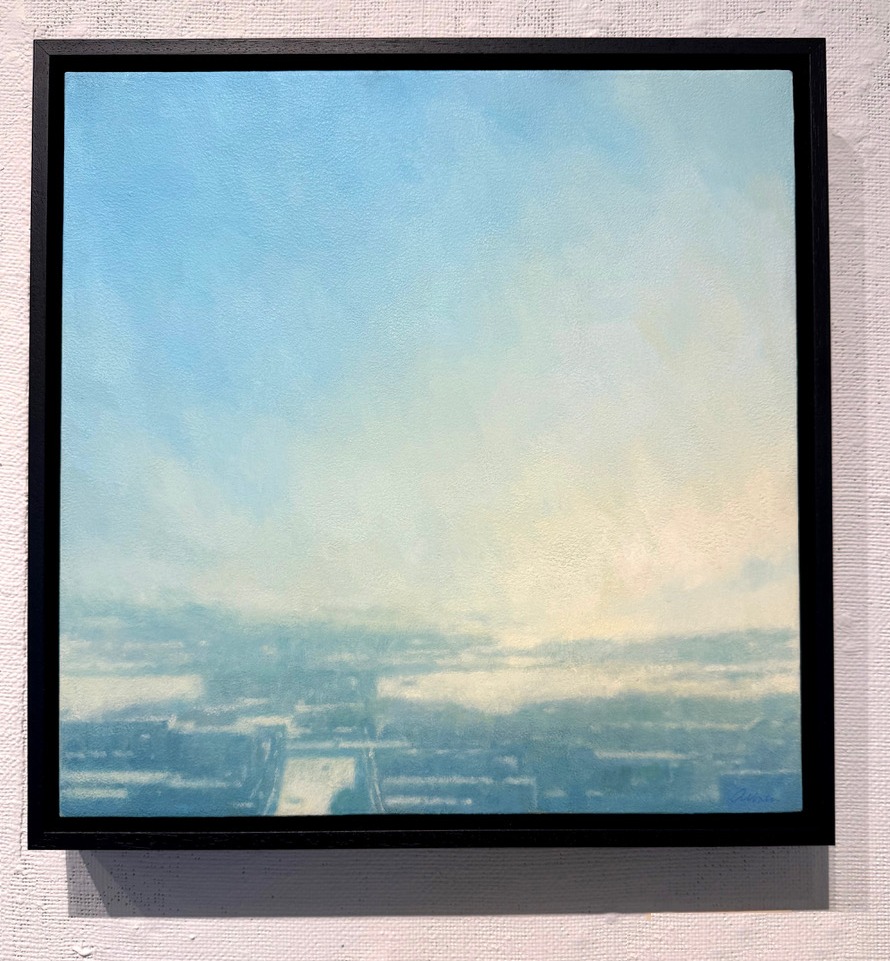 On the farthest wall are works by Mitchell Albala, who studies Zen-like, ethereal, layered distance cityscapes and landscapes. He paints with oil and pastel on canvas or board. So much is described with so little information. You find yourself at a measured contemplative distance from his chosen environments, his hues are restrained yet explorative. His palette is unified with dancing nuances of similar or complementary pastel colors. There is a sensitivity in which shimmering distance is portrayed; what is revealed, what is left to your imagination, is a clever dance within the image. Like Rothko, Albala’s paintings are studies in contemplation and reflection. They require you to take your time and look closely into the distance. Detail is often abandoned in favor of texture, bounced light, and sensitivity, and yet there are details to remind you where you are. His paintings require you to keep looking and get lost in what is beyond the apparent.