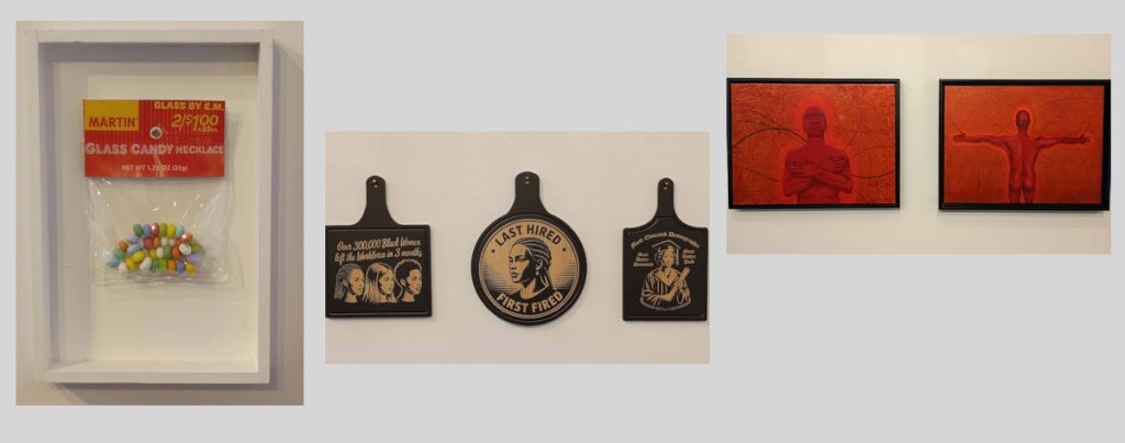 Near the entrance, there’s an eye-catching series of pieces that show off the variety of not only styles, but voices and tones on display in the show. Emily Martin’s Candy Necklaces is a blown glass piece that’s been packaged to look like those 2/$1.00 corner store candies that seem to have existed forever, yet are manufactured by nobody; it’s enough to transport you to days scraping up couch change as a kid. Nearby is Jasmine Iona Brown’s Black Women Cutting Boards, a stark ode to the 300,000 Black women who lost their jobs in the first six months of the Trump administration. It’s a clash of dreamy childhood innocence and the striking injustices of adulthood, with a persistent thread of economic stress running between both.