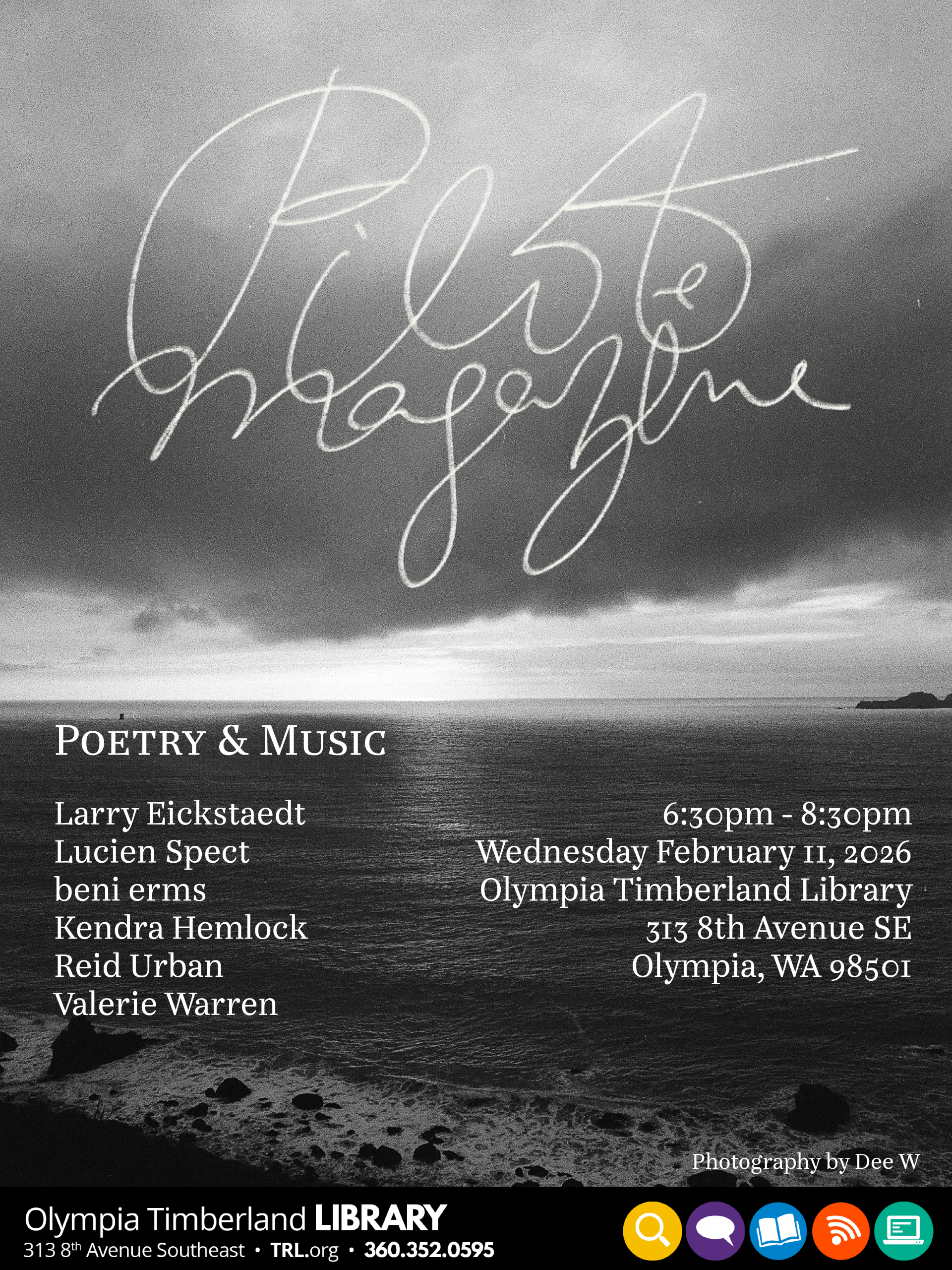 Olympia Timberland Library 313 8th Ave SE, OlympiaPilot Magazine brings together an eclectic group of local artists to present new and old works at the Olympia library. Join us for an evening featuring: Larry Eickstaedt Lucien Spect beni erms Kendra Hemlock Reid Urban Valerie Warren Pilot Magazine is a locally created and produced, Arts & Culture magazine in South Puget Sound.