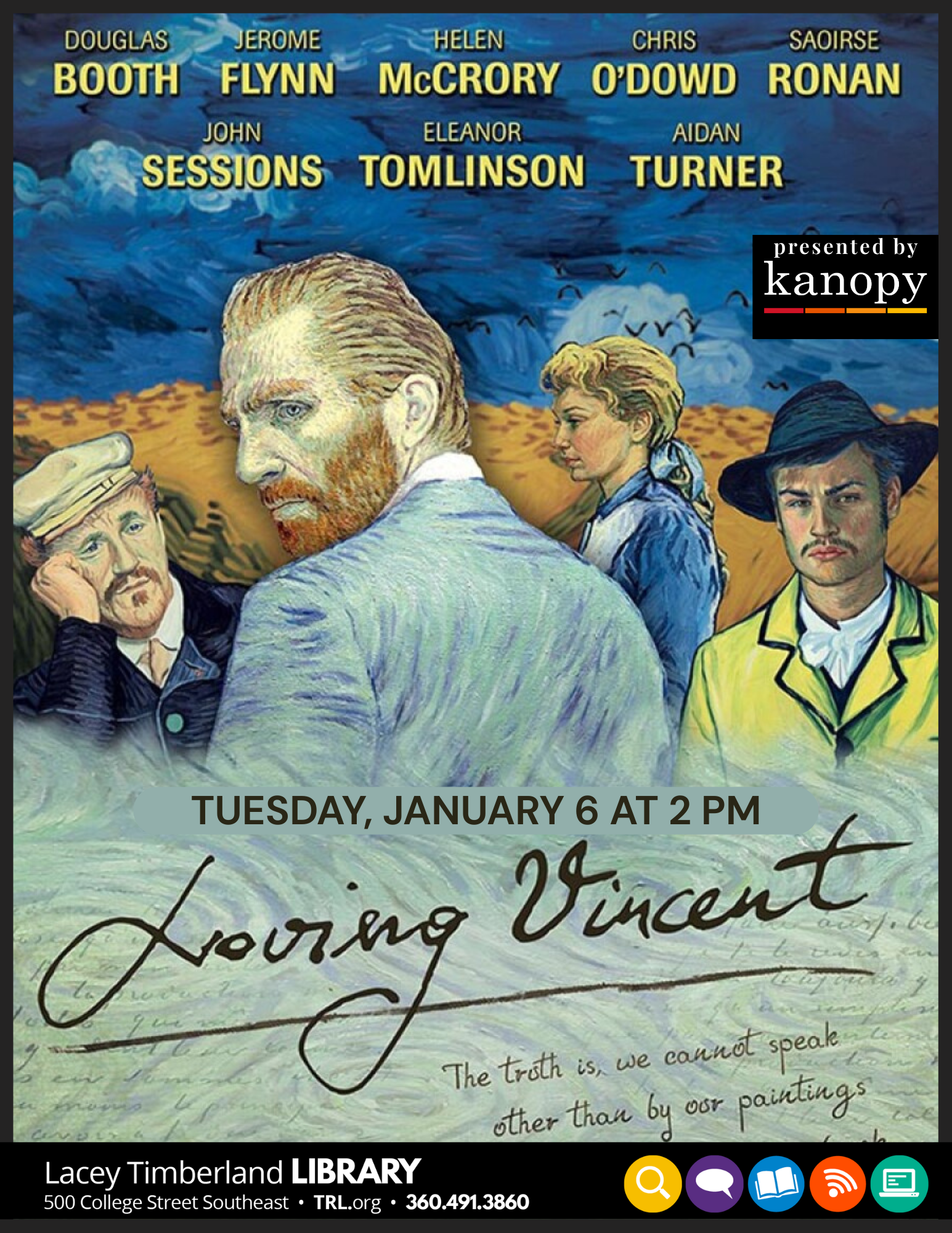Lacey Timberland Library 500 College St SE, Lacey, WA, United StatesExperience art like never before. Join us for The Painted Screen, a new monthly series exploring the lives and legacies of artists who have shaped how we see the world. Each screening offers a window into the creative spirit...journeys of color, passion, and imagination told through the power of film. Our debut screening, Loving Vincent, immerses viewers ...