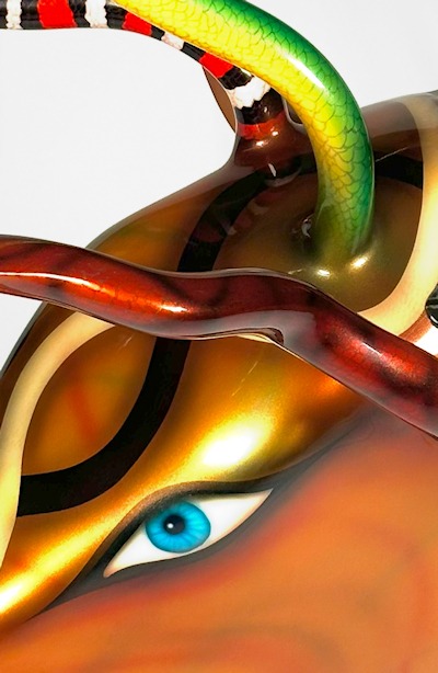 For 10 years, he worked in his brother’s auto repair/paint shop. There he painted a series of automobile hoods to be hung on walls as art. Many of these will be shown in the retrospective exhibition. Also included will be polymeric steel painted sculptures. “I created my own medium for these sculptures: mild steel, polymeric resin, acrylic urethane,” Sederberg explained. “The finished pieces look like glass, and make people wonder and guess at the material. The material accepts the paint in an arrestingly luminous fashion.”