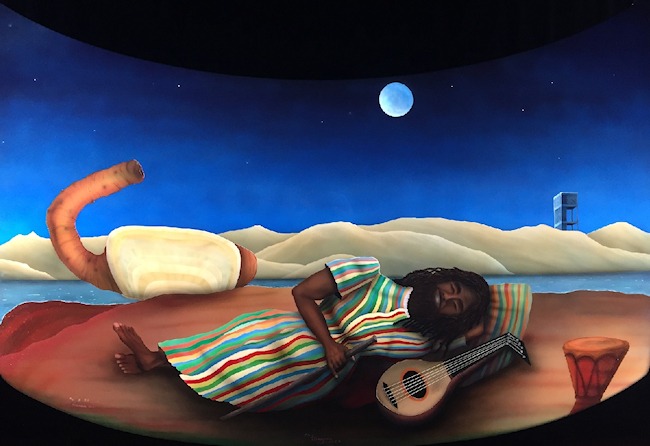 Or Sleeping Greener, a parody of Henri Rousseau’s famous painting Sleeping Gypsy. Instead of Rousseau’s sleeping lion, Sederberg painted a sleeping geoduck, the silly Evergreen State College mascot.