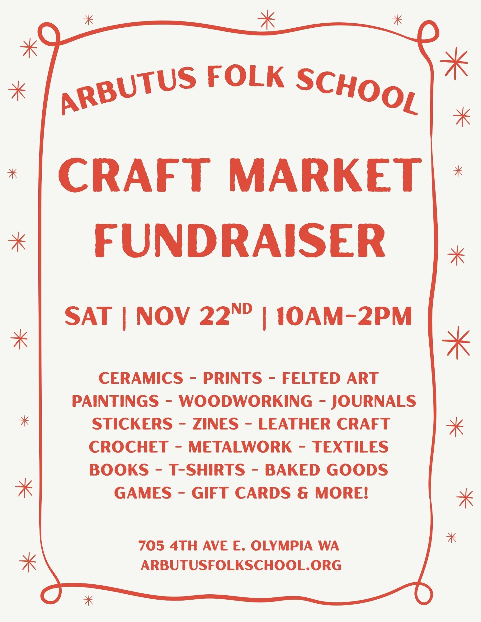 Join us for at our semi annual Craft Market Fundraiser on November 22nd 10am-2pm at Arbutus Folk School.
