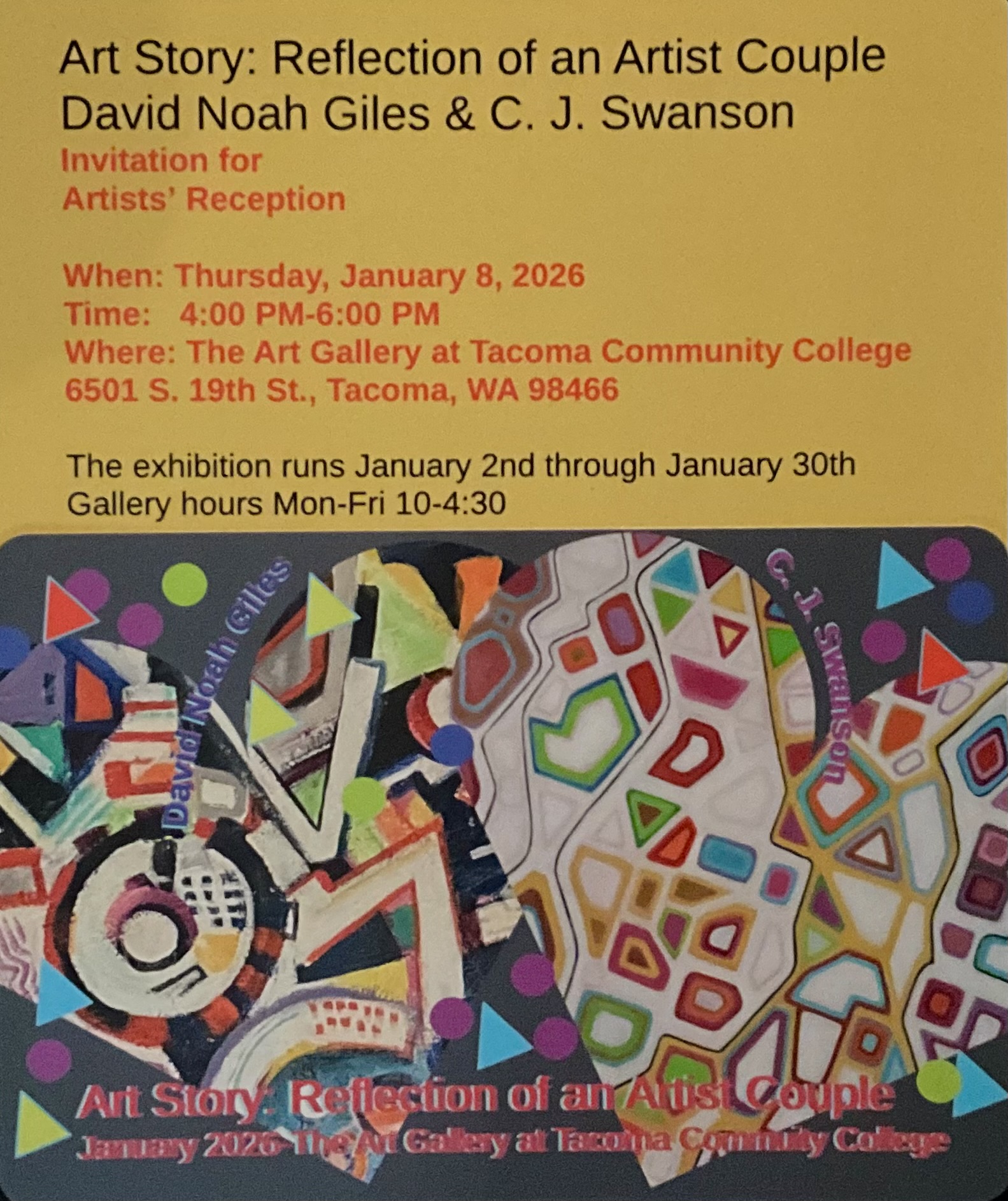 Two Tumwater based artists will have an art reception for their January exhibition at The Art Gallery at Tacoma Community College on Thursday, the 8th from 4:00-6:00 PM. The show is titled “Art Story:Reflection of an Artist Couple”. Please join David Noah Giles and C. J. Swanson for this event, thank you. The show runs throughout the month of January, If you miss the opening there is also an artist talk later in the month. See, TCC web site for more details.