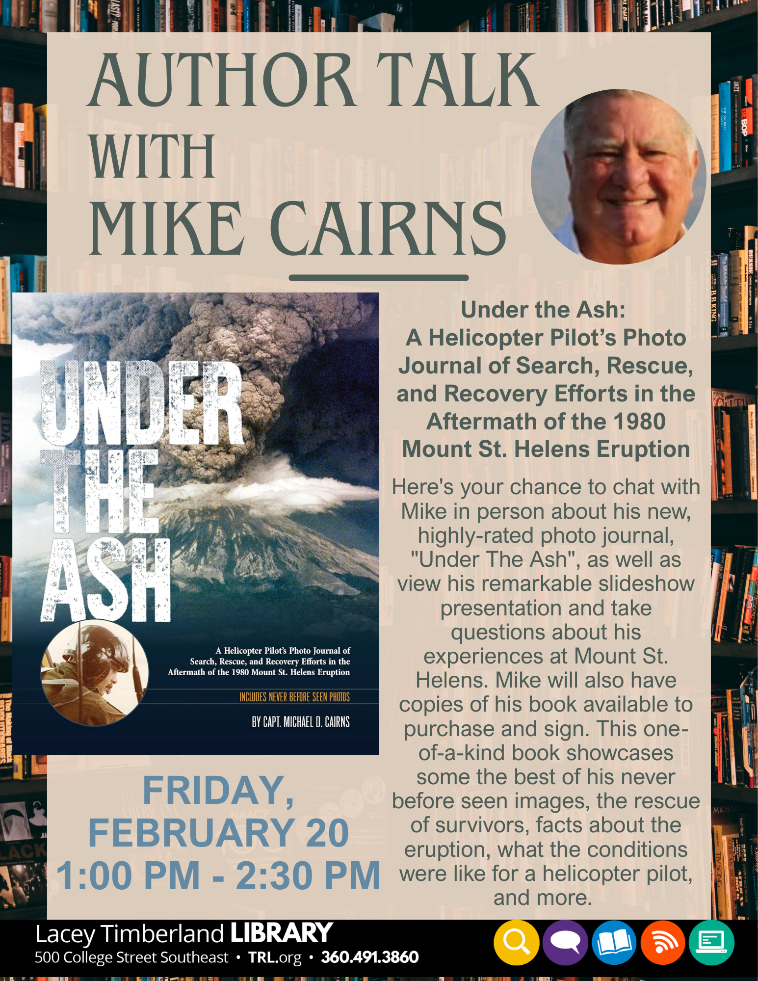 Presentation and Book Signing At 12:30pm on May 18, 1980, Washington Army National Guard helicopter pilot Captain Mike Cairns flew beneath the ash cloud of the Mount St. Helens volcano eruption – a feat never before attempted in history. In the challenging days that followed, as Mike, his crew, and fellow National Guard pilots flew numerous search, rescue, and recovery missions, he documented the devastation they encountered with photographs taken with his own 35mm camera. Those missions, over 600 in all, would lead to three pilots and five crew members receiving the Valley Forge Cross. Mike was one of those three pilots awarded the National Guard’s highest honor for heroism. Here’s your chance to chat with Mike in person about his new, highly-rated photo journal, Under The Ash, as well as view his remarkable slideshow presentation and take questions about his experiences at Mount St. Helens. Mike will also have copies of his book available to purchase and sign. This one-of-a-kind book showcases some of the best of his never before seen images, the rescue of survivors, facts about the eruption, what the conditions were like for a helicopter pilot, and more.