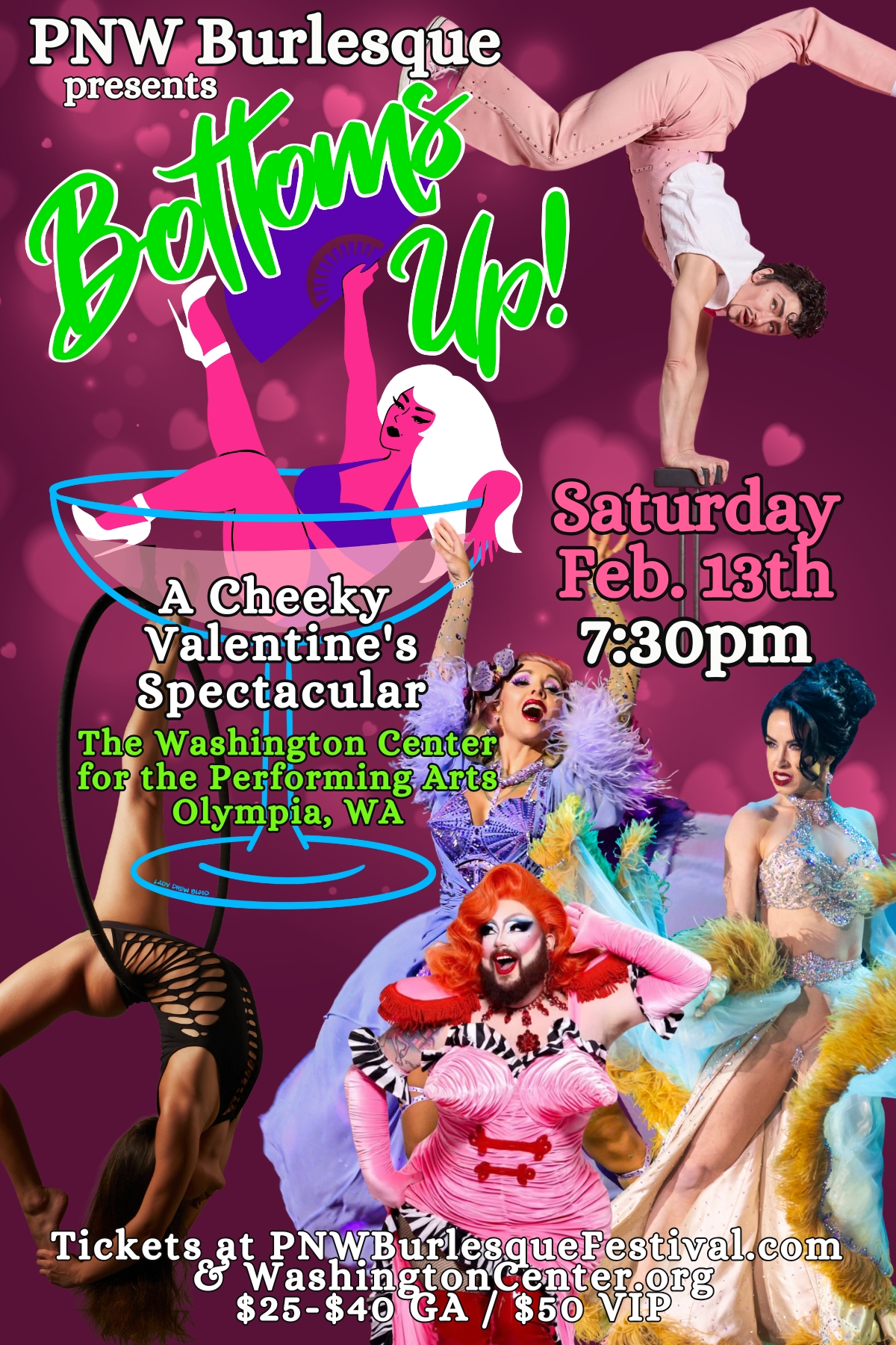 PNW Burlesque presents “Bottoms Up”, A Cheeky Valentines Spectacular! Join us on Friday February 13th for an unforgettable evening of glamour, comedy, and sultry entertainment in celebration of love, lust, and everything in between at the beautiful Washington Center for Performing Arts Main Stage in downtown Olympia. Whether you’re drinking to remember, or drinking to forget, our Valentine’s Day burlesque and circus spectacular promises an evening filled with sensational performances, and sizzling acts from some of the best performers in the Pacific Northwest! More Information and Details at PNWBurlesqueFestival.com Video Link: https://www.youtube.com/watch?v=mq85jXlIFa8