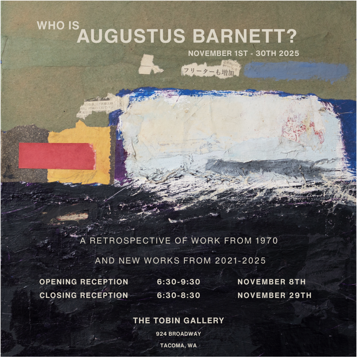 A 50 year retrospective of legend Augustus Barnett III. In 1969, newly graduated from Stadium HS, Augustus opened up ‘The Sopwith’ a fine Art Gallery on 17th and Jefferson in downtown Tacoma. 50 years later he started painting again after a 40 year career in Advertising. We have works from 4 decades anchored by his recent work since 2021. 90% of the Art is for sale. Hope you can find the time to find out about this fascinating man and his compelling Artworks. Mixed Media Collage: Rare Asian papers and Acrylics.